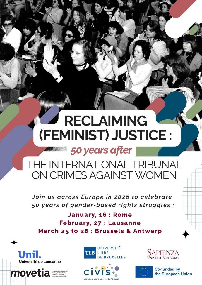Fifty years later, thanks to the CIVIS funding instrument “Student-Led Projects Call 2025,” three days of commemoration will be organized in Rome, Lausanne, and Brussels, respectively. For the study day in Lausanne, we aim to create a space for critical and interdisciplinary reflection on the legacy, extensions, and contemporary resonance of the International Tribunal on Crimes Against Women. Building from this event, we will use a thematic panel format to examine forms of feminist speech, mobilization, resistance, and justice in the face of systemic violence against women. In addition to the panels, we will offer meetings with associations and individuals involved in the fight against violence against women, designed as spaces for exchange, discovery of programs, and transmission of tools.